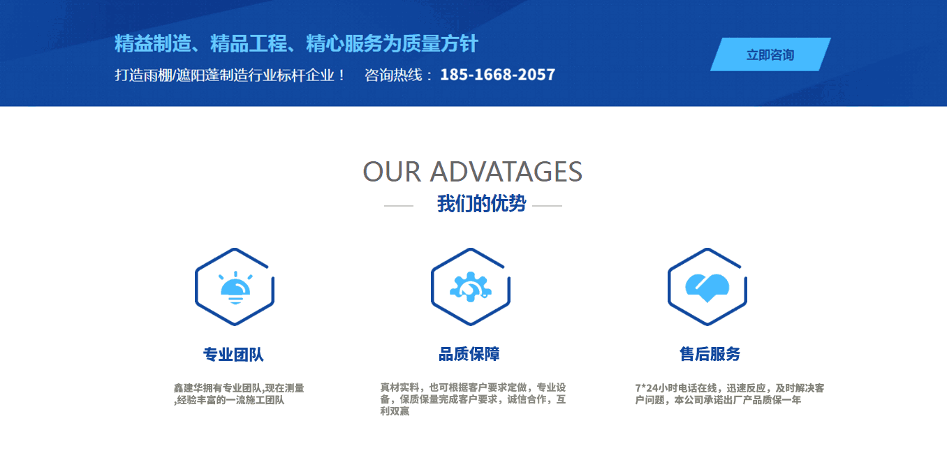 鑫建華雨棚有限公司成立于2012年,公司全體勵精圖治,飛速發展,已從初創業公司發展成為多元化公司,目前公司員工約1000余人,其中擁有中、高級專業技術人員100余人,形成以戶外制造產業為主,其他第三產業為輔的多元式經營模式,旗下設有鋼結構公司,環保設備公司.其鋼結構公司主要以研發,設計、生產、營銷、安裝、服務為一體的鋼結構生產制造型企業,環保設備公司主要以“綠色環保節能“為核心戰略品牌.公司相關資質齊備,主營業務:定制各種推拉蓬、活動雨棚、倉庫雨棚、智能電動蓬、伸縮電動噴漆房、懸空電動雨棚等手動,遙控電動一體,系列產品,公司總部位于中國.江蘇,目前,公司年經營規模達8千萬以上,經營區減已輻射全國大部份省會城市,在雨棚領域展露崢嶸,“鑫建華品牌“已成為國內雨棚,在全國市場的占有率及品牌均名列前茅.  公司在蘇州、天津、重慶、武漢、濟南、鄭州、江門、衡陽均設有工廠,覆蓋全國主要城市、八倉生產制作安裝售后、國內訂單全國范圍可上門安裝服務、國外訂單可派工程師出國指導安裝....